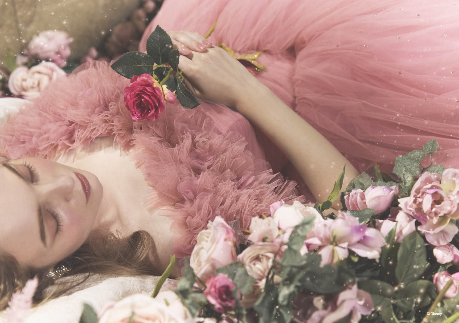 「オーロラ姫」にインスパイアされたエレガントで女性らしいローズピンクのチュールドレス。
