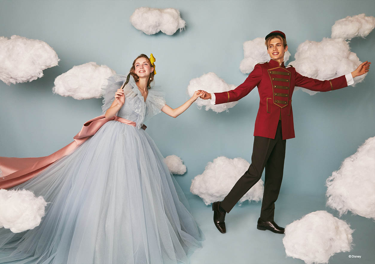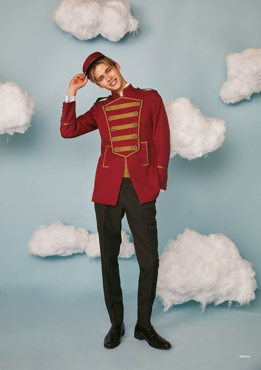 『ダンボ』に登場するネズミの「ティモシー」のスタイリングイメージをインスパイアした、レッドベースにゴールドのトリミングを効かせたスタンドカラーのタキシード。共生地の胸当てやゴールドのエポーレット&胸前のベルト、ブラウンのボトムなどよりキャラクターを彷彿とさせるディテールでまとめています。