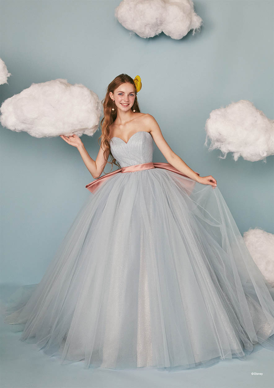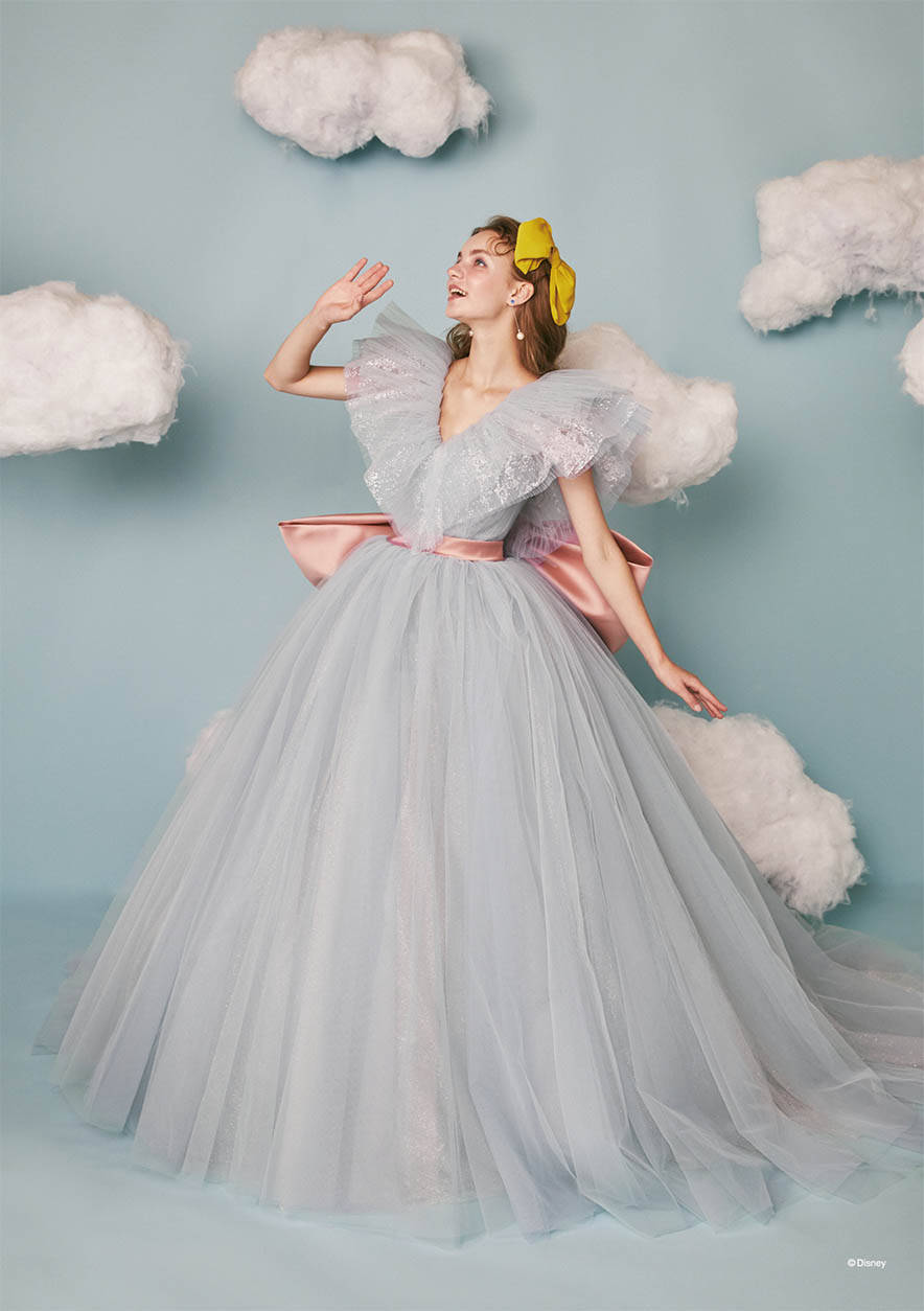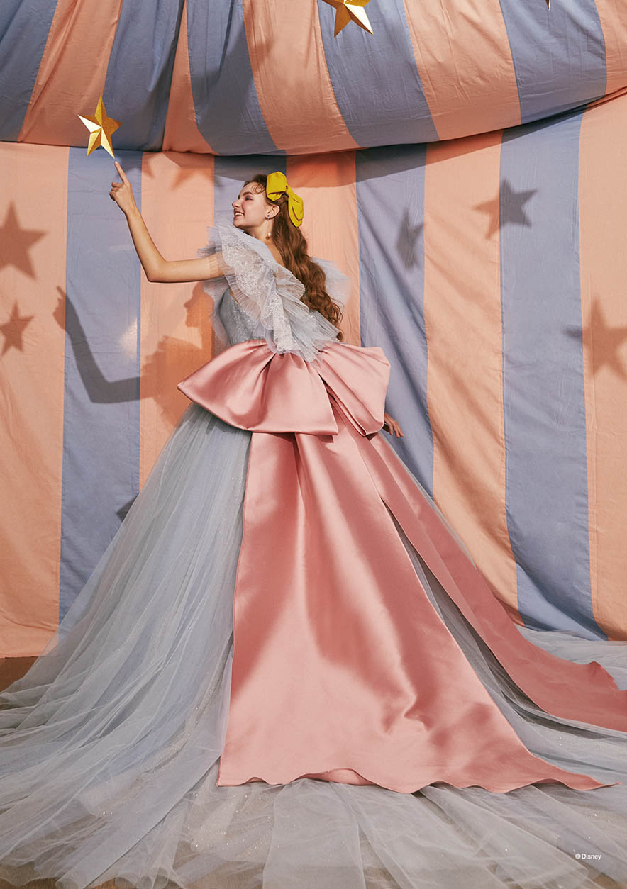 大きなV 字のショルダーフリルや、バックスタイルのピンクビッグリボンの組み合わせで、「ダンボ」の大きな耳をイメージしたビッグラインドレス。少しくすませたブルーチュールの奥にはキラキラ輝くグリッターチュールを忍ばせ華やかに。