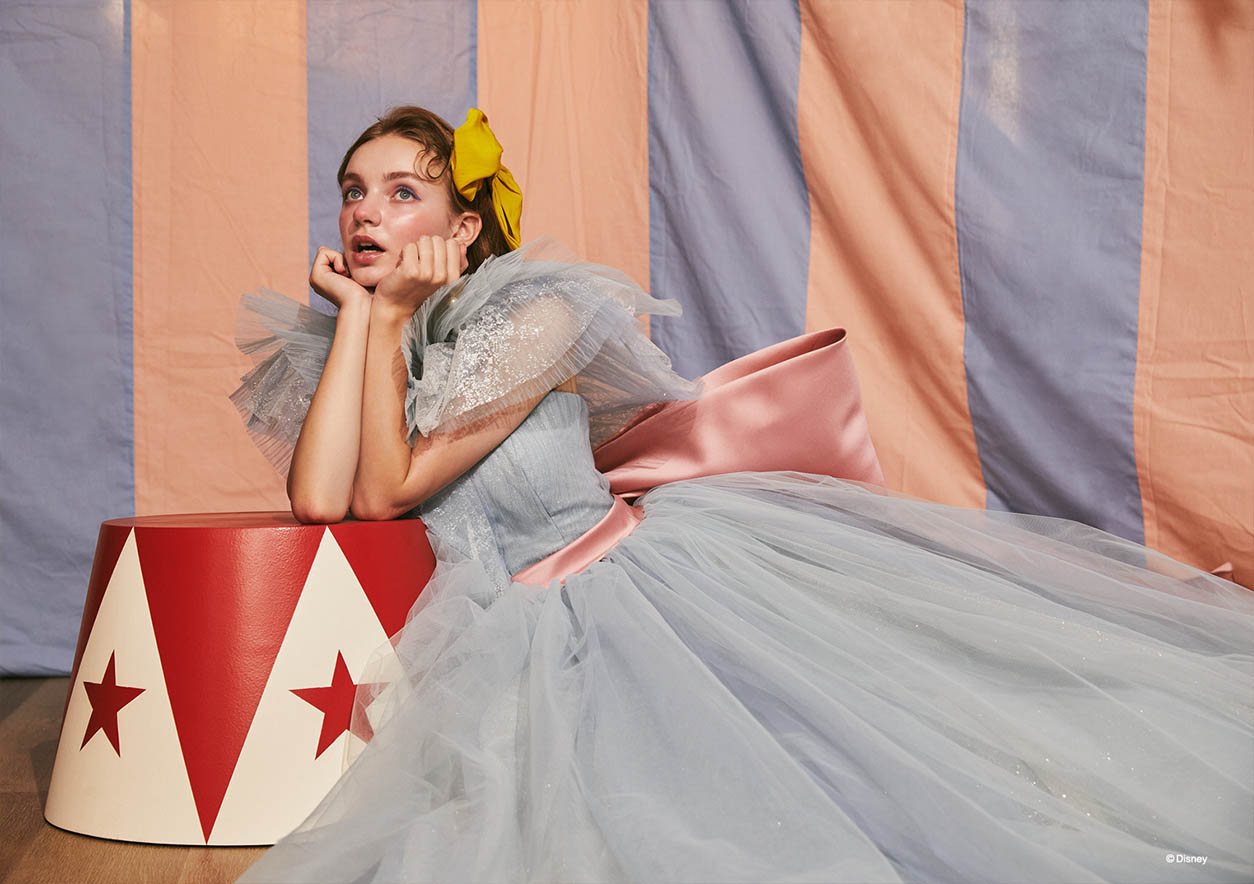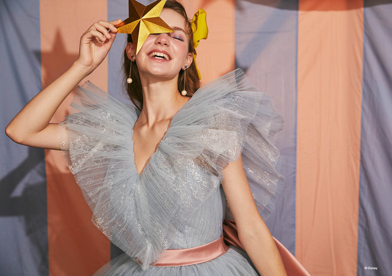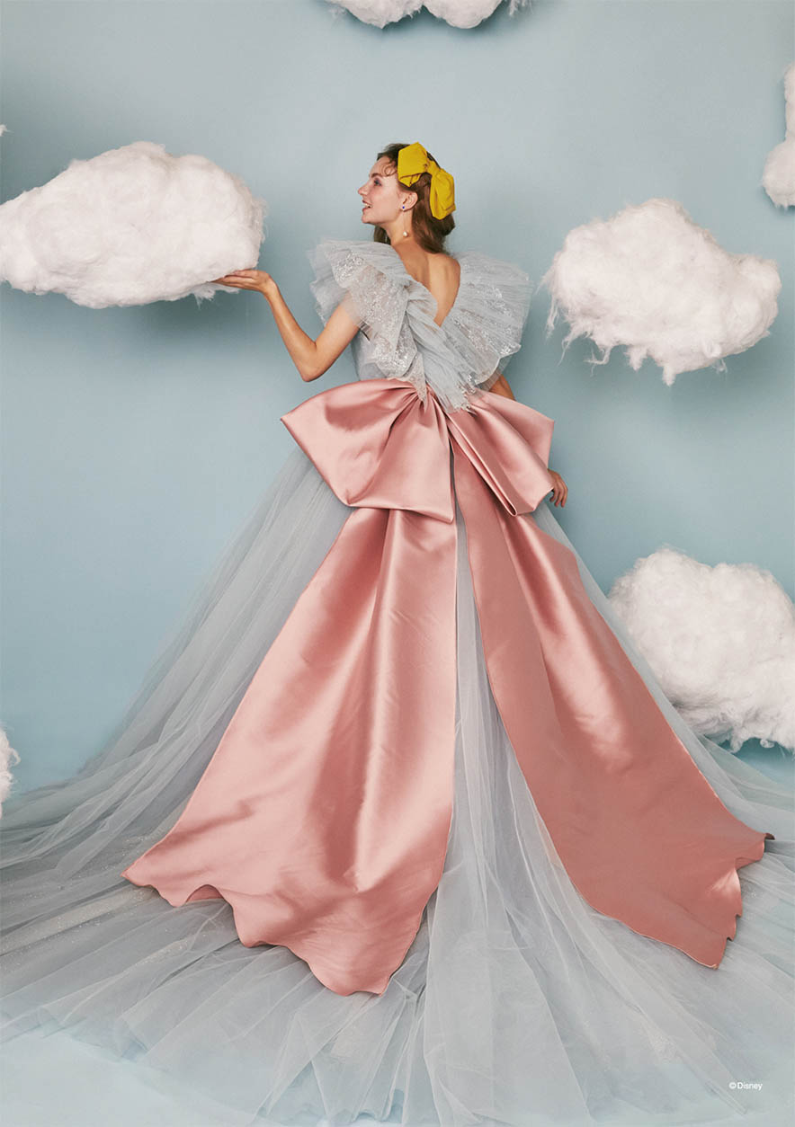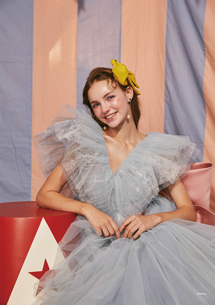 大きなV 字のショルダーフリルや、バックスタイルのピンクビッグリボンの組み合わせで、「ダンボ」の大きな耳をイメージしたビッグラインドレス。少しくすませたブルーチュールの奥にはキラキラ輝くグリッターチュールを忍ばせ華やかに。