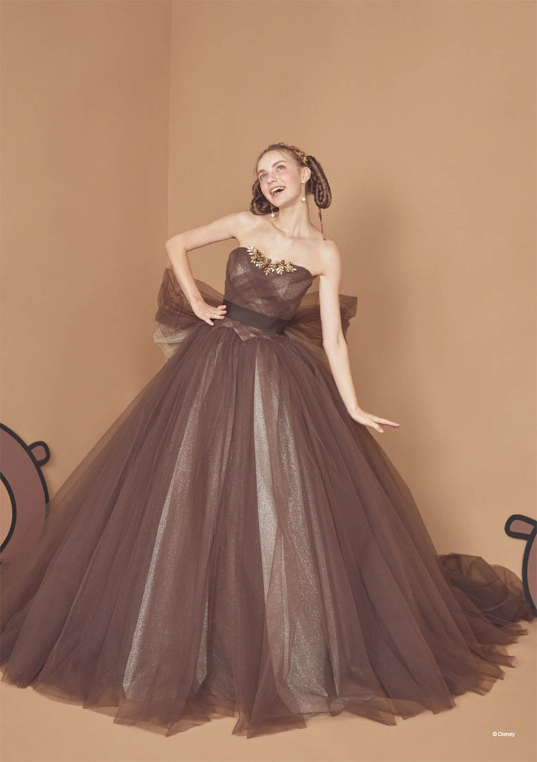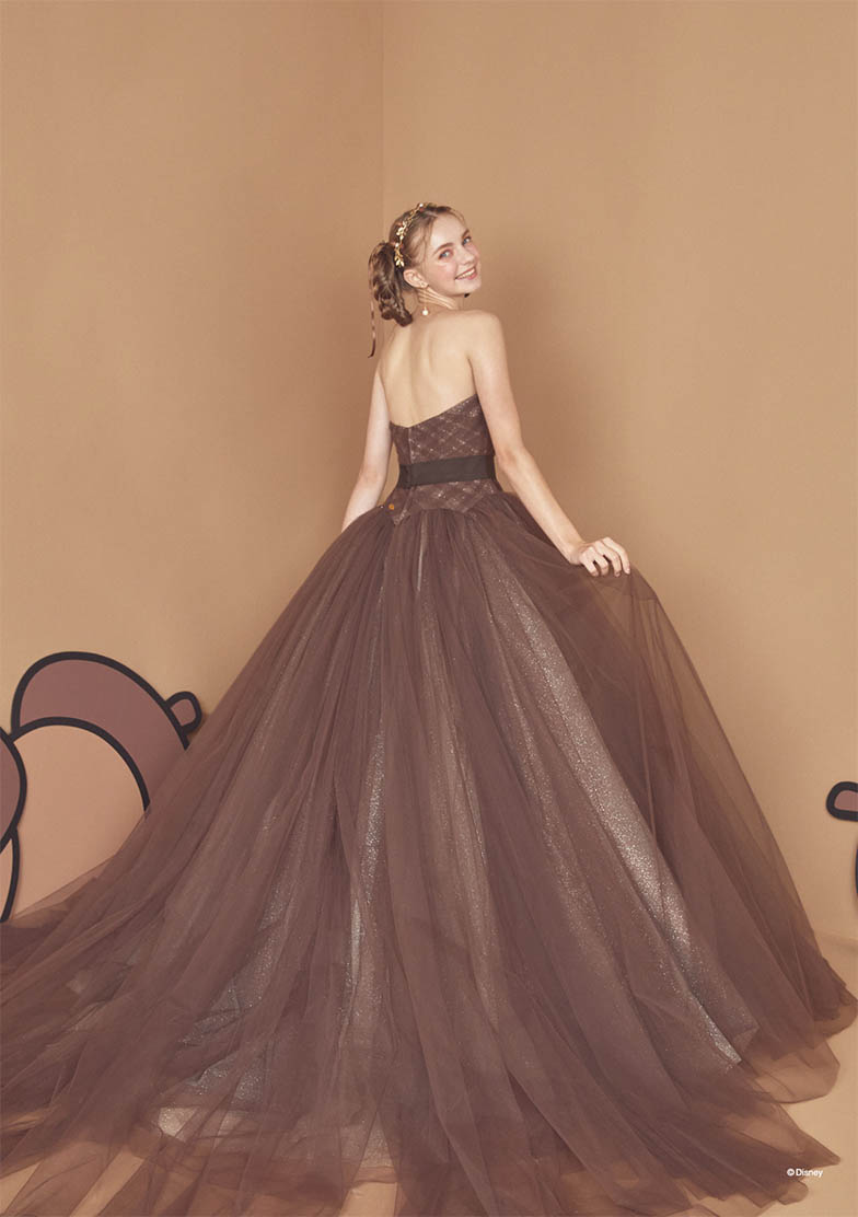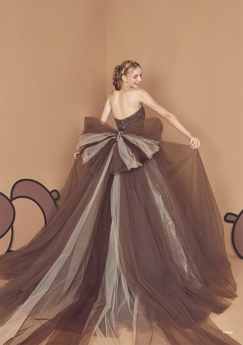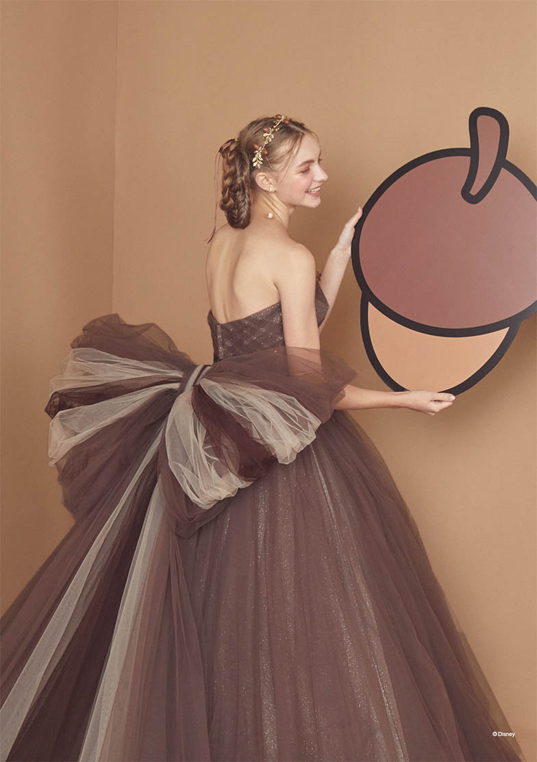 「チップとデール」をインスパイアしたブラウンチュールの可愛らしいボリュームドレス。バックスタイルの大きなリボンで背中の縞模様を表現。胸元にはさりげなくどんぐりモチーフが入ったブローチを。ウエスト接ぎも山型にデザインして「チップとデール」のモコモコ感を演出。