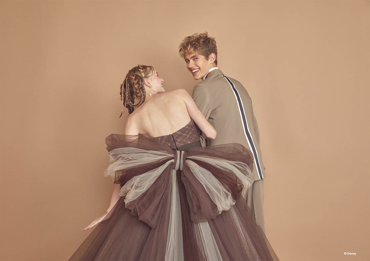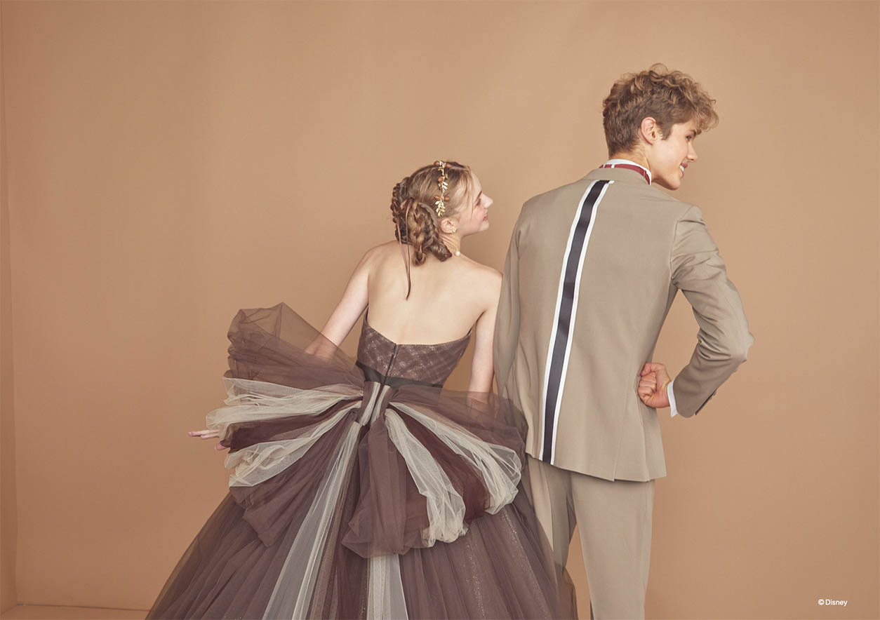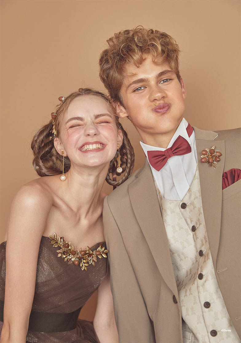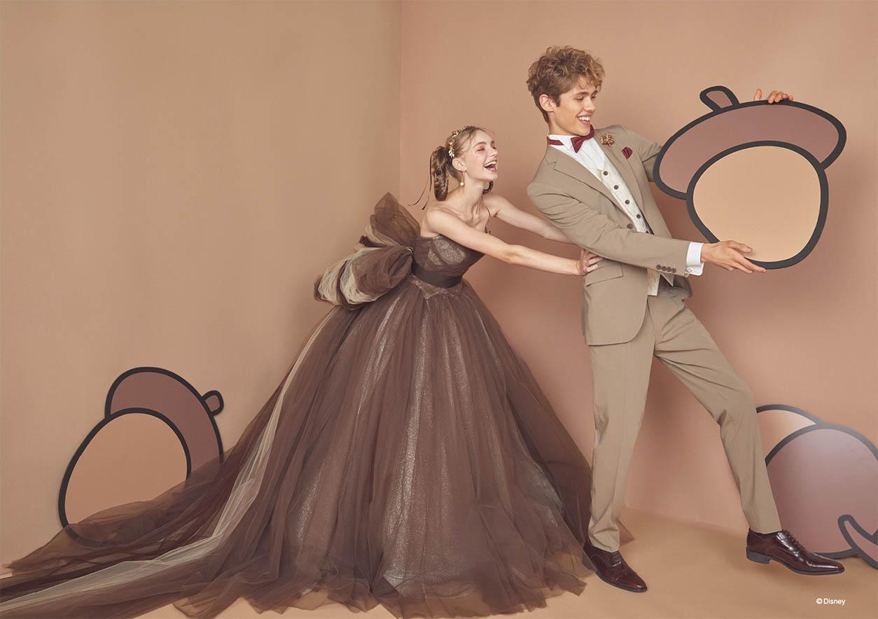 「チップとデール」をインスパイアしたブラウンチュールの可愛らしいボリュームドレス。バックスタイルの大きなリボンで背中の縞模様を表現。胸元にはさりげなくどんぐりモチーフが入ったブローチを。ウエスト接ぎも山型にデザインして「チップとデール」のモコモコ感を演出。