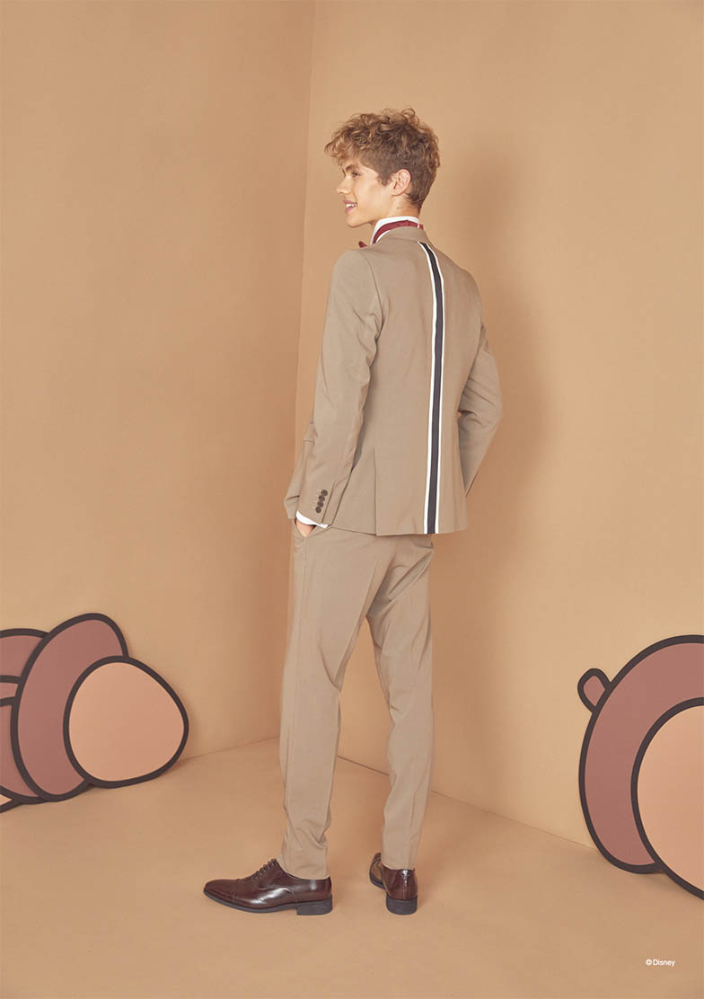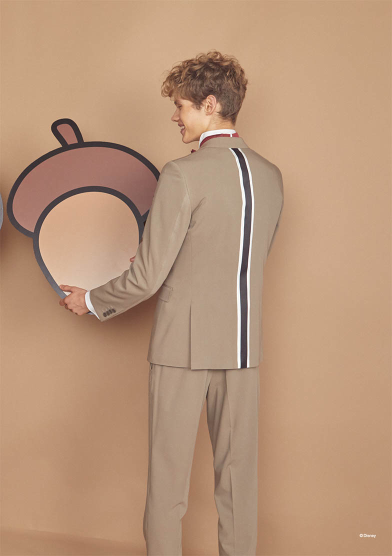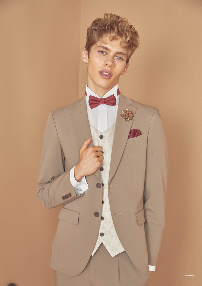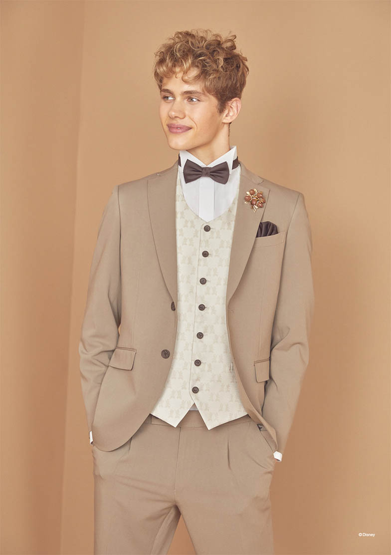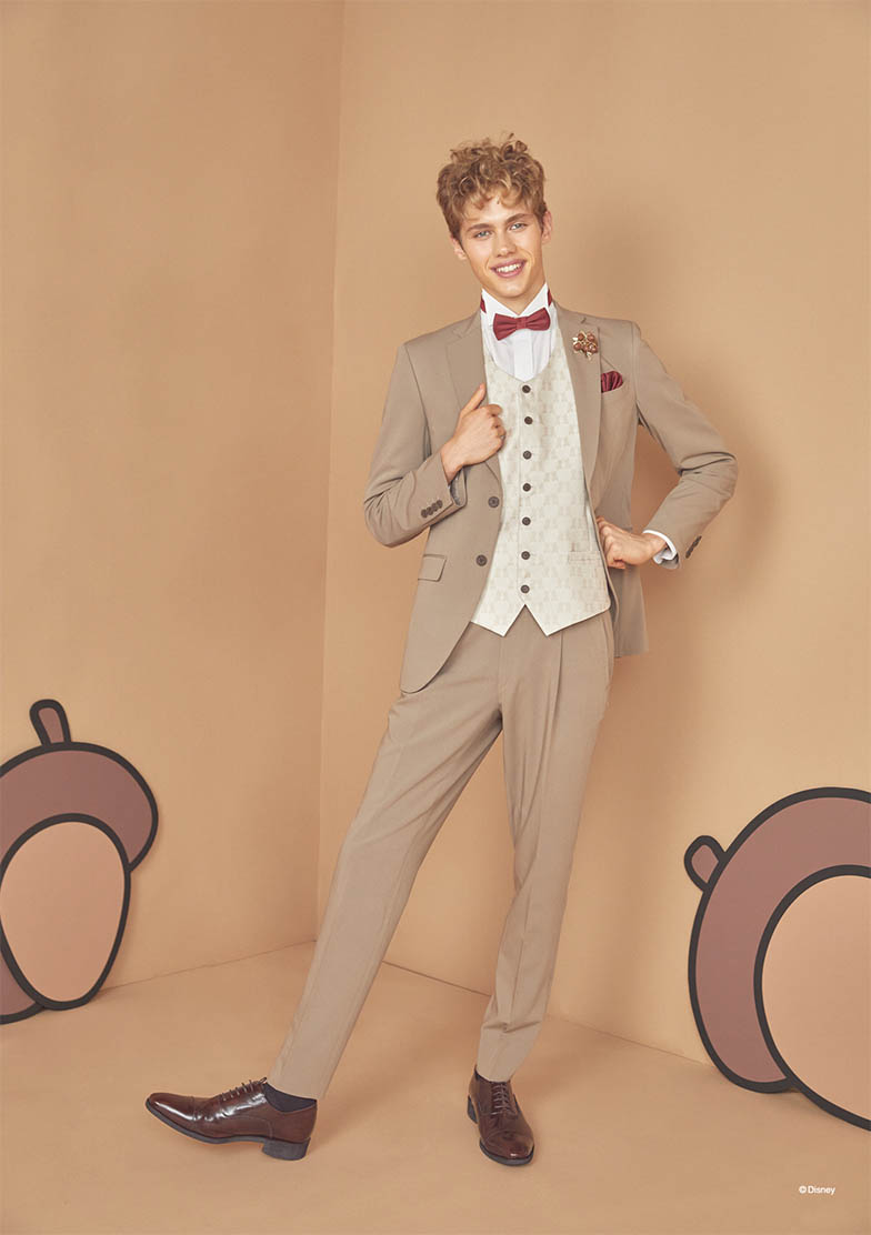 「チップとデール」のカラーリングイメージをインスパイアしたシングル×2ツ釦、ノッチドラペルのタキシード。後中心にはシマリスを表現する白×黒のストライプ状テープで切替えを施し、「チップとデール」の鼻色を表現した蝶タイ・チーフは赤とコゲ茶それぞれ2種をセットしています。