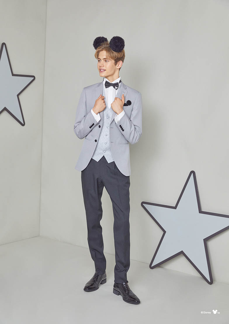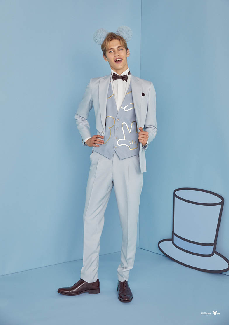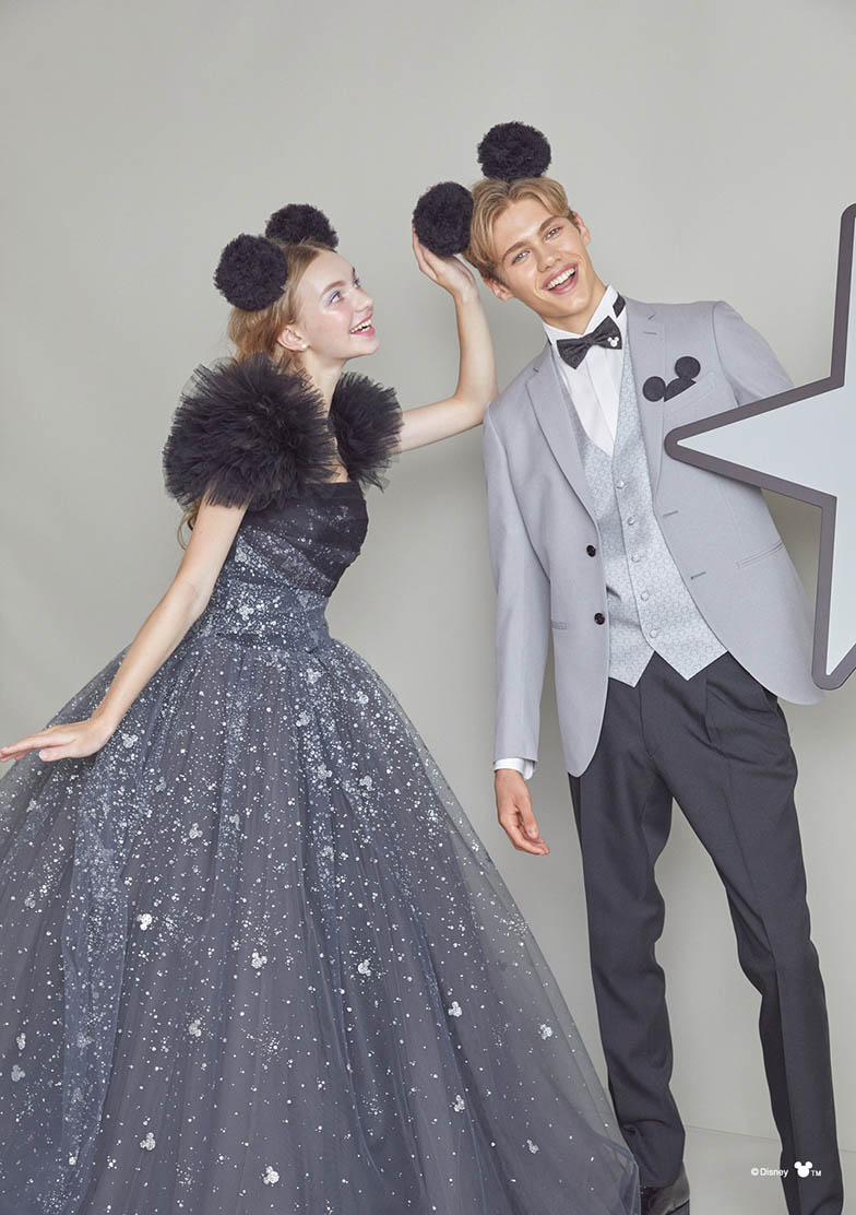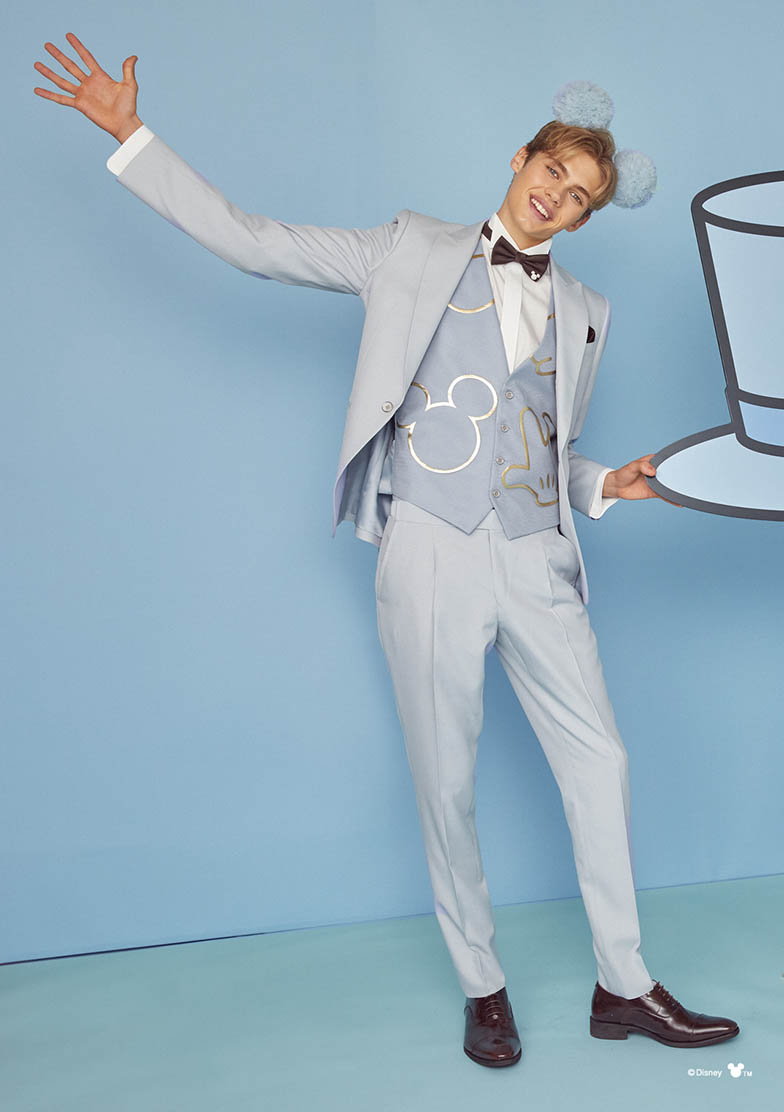 くすみ感のあるマットなサックスブルー素材をジャケット&パンツに使用し、ベストにはドレスと同素材の「ミッキー」のパーツをモチーフにした箔チュールプリントをあしらい、同色系コントラストで上品なカラーコントラストにまとめたシングル× 1 ツ釦、ピークドラペルのタキシードです。