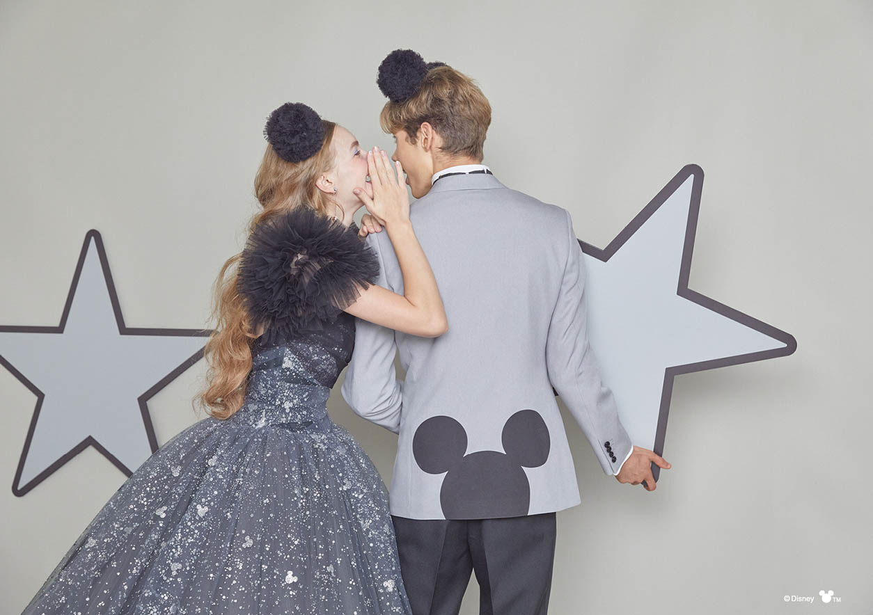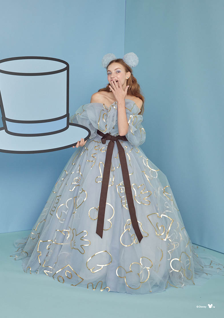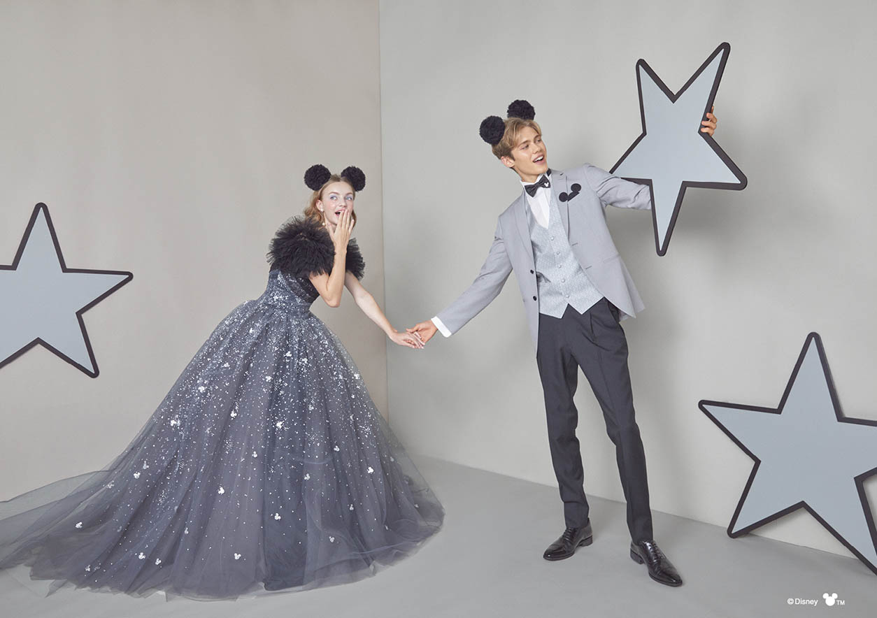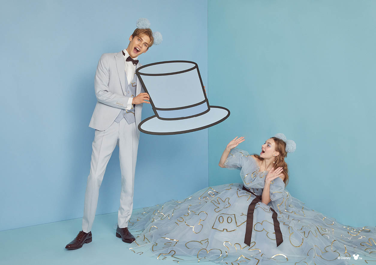 くすみ感のあるマットなサックスブルー素材をジャケット&パンツに使用し、ベストにはドレスと同素材の「ミッキー」のパーツをモチーフにした箔チュールプリントをあしらい、同色系コントラストで上品なカラーコントラストにまとめたシングル× 1 ツ釦、ピークドラペルのタキシードです。