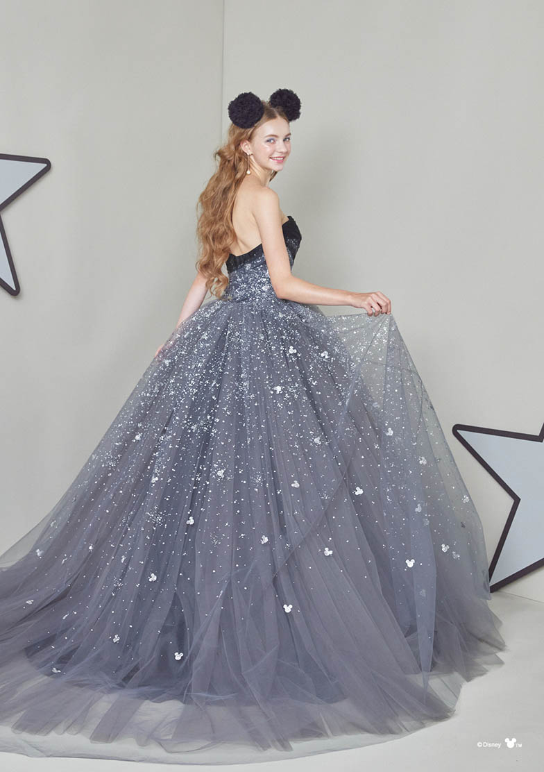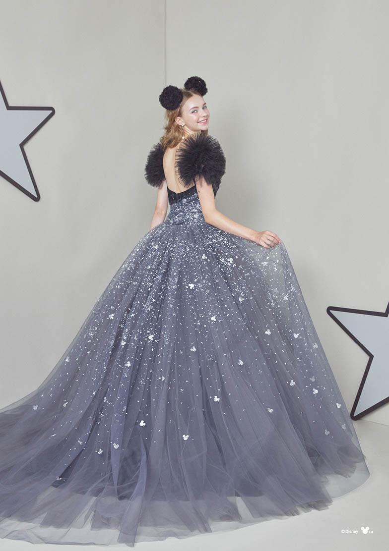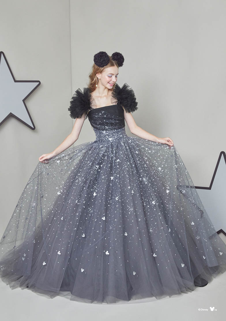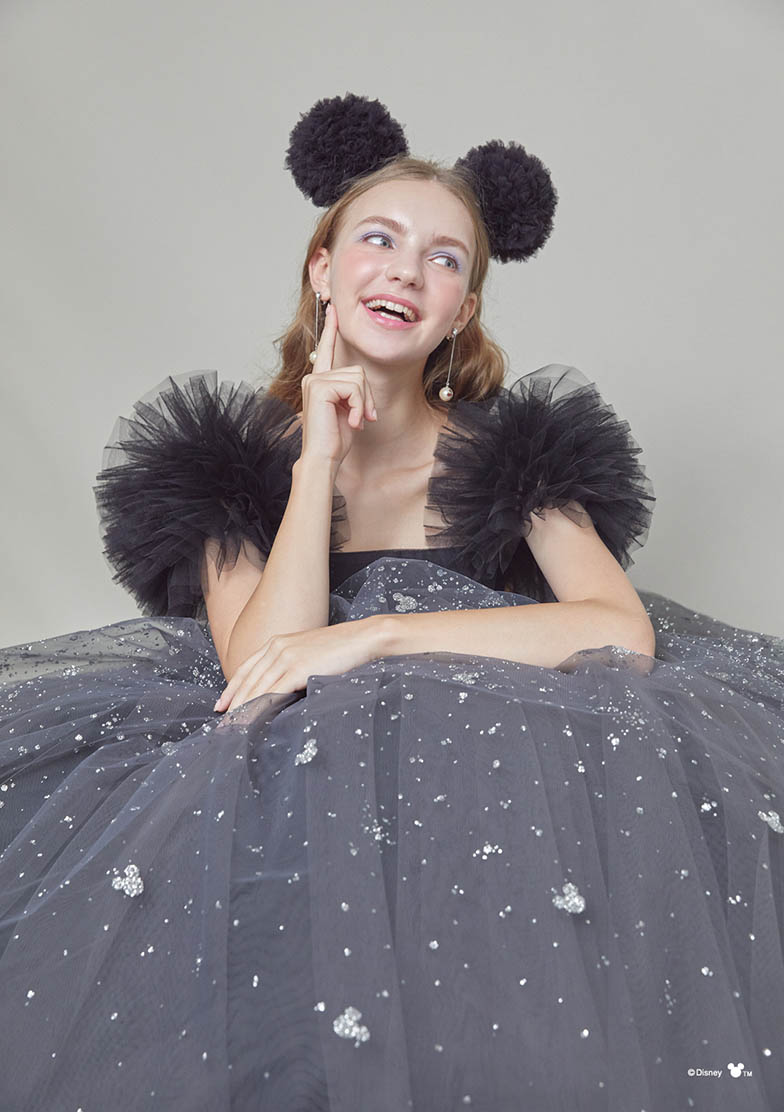 「ミッキーマウス」のアイコンをさりげなくグリッターの柄にしのばせたキラキラドレス。チュールフリルのショルダーは「ミッキーマウス」の耳をイメージ。おしゃれで可愛く、遊び心をくすぐる一着です。