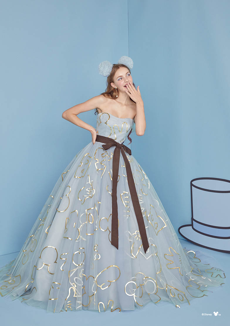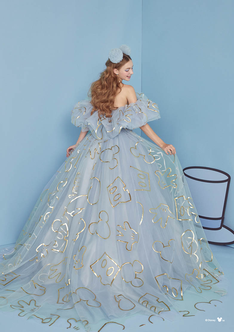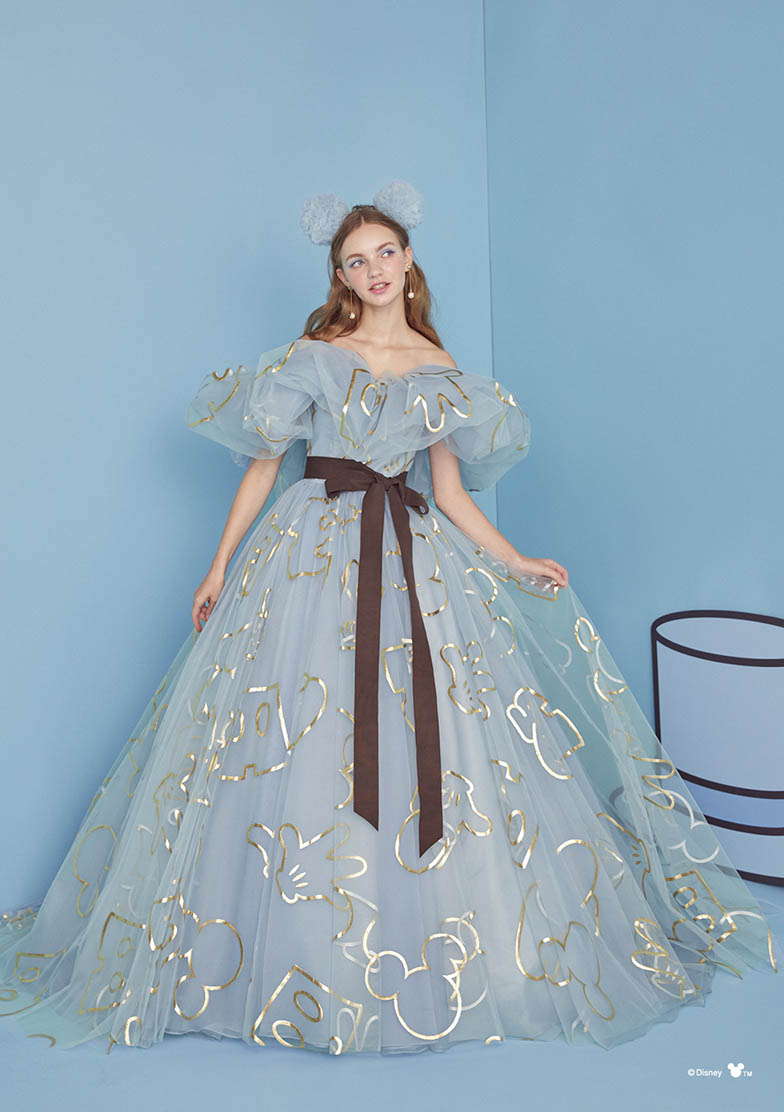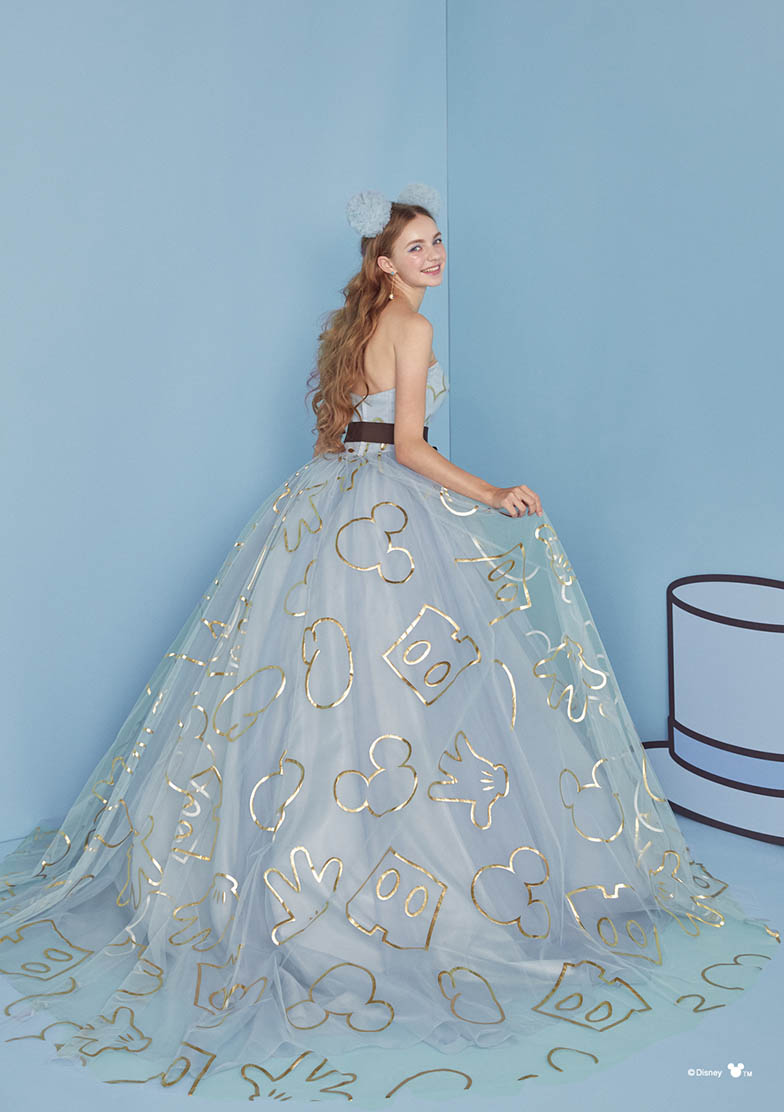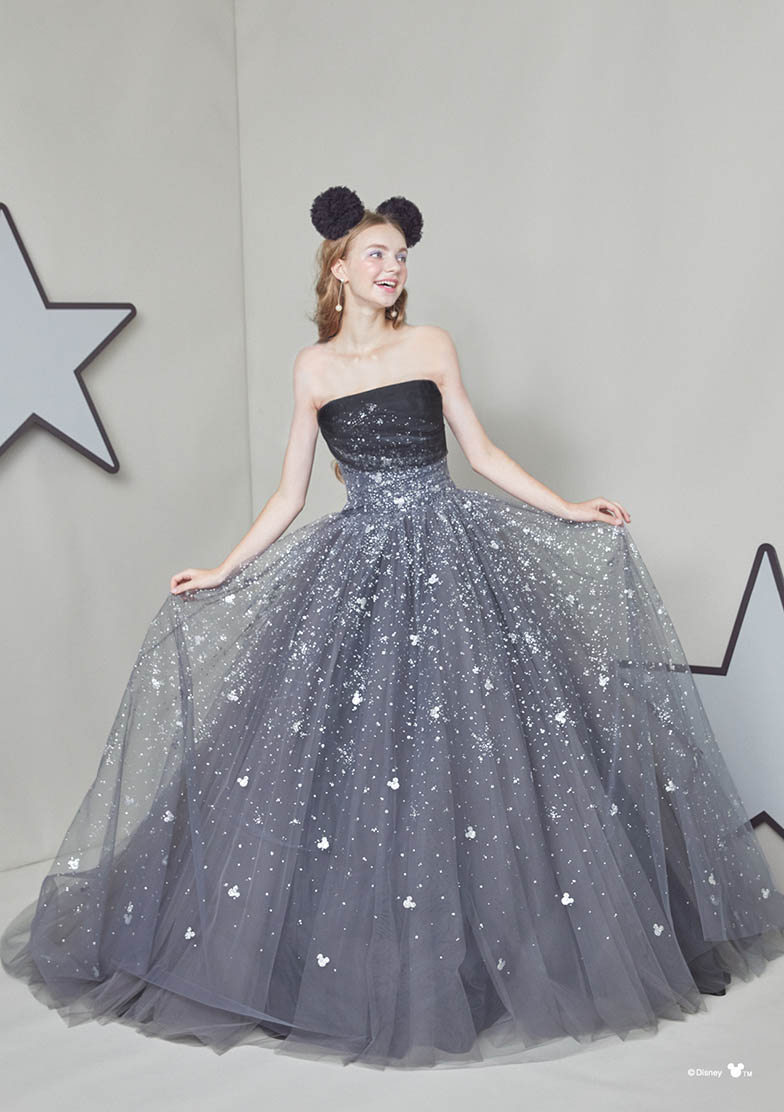「ミッキーマウス」のアイコンをさりげなくグリッターの柄にしのばせたキラキラドレス。チュールフリルのショルダーは「ミッキーマウス」の耳をイメージ。おしゃれで可愛く、遊び心をくすぐる一着です。