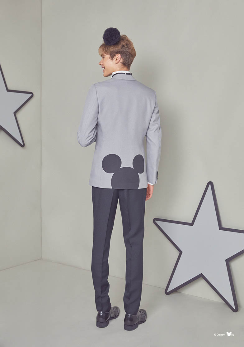 ミディアム~ライトトーンのマットなトップグレー素材を使用したジャケットに背面裾から半分覗いているような配置でミツマルの大きなプリントをあしらった、シングル×2ツ釦、ノッチドラペルのジャケ&スラ異素材コーデのタキシード。ベストにはミツマルモチーフの連続柄ジャカードを使用、胸ポケットにはポケットチーフ代わりにミツマルのワッペンで随所に「ミッキー」要素を鏤めました。