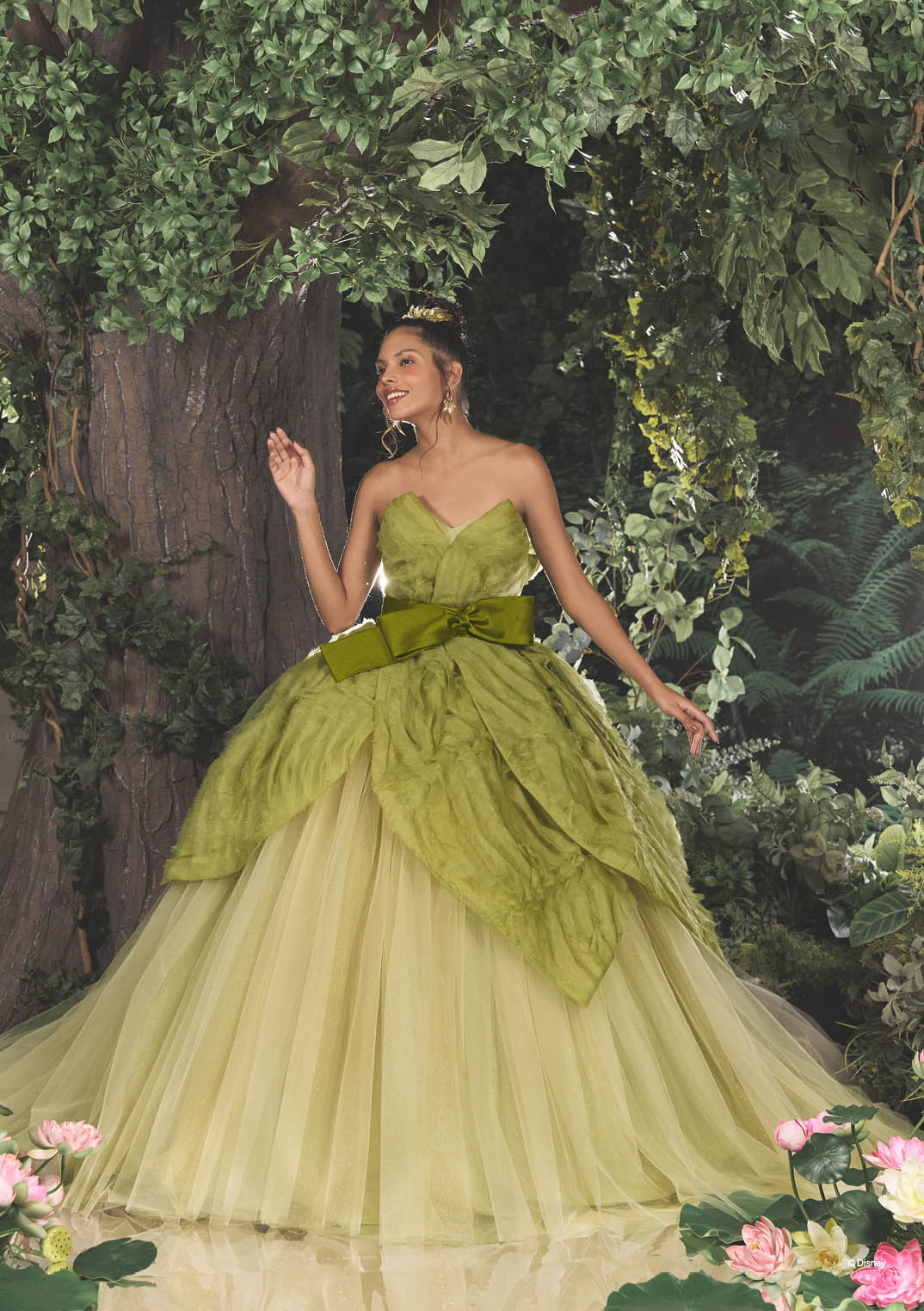 繊細なゴールドのグリッターチュールが魔法の煌めきを表現し、ミカド素材のリボンが全体を引き締める優美な1着です。